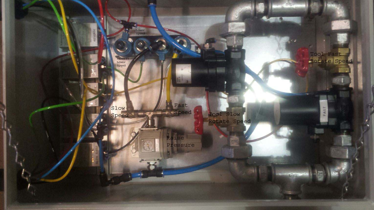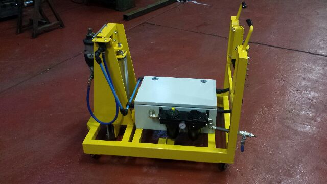 This rig with pneumatic operation was used to position large (M30) bolt into plates fixed to the underside of ‘Yellow Plant’ machinery. The controls helped with positioning, screwing bolts home (including raise and slow turn functions) and to undo bolts. We fitted the rig on wheels to make it portable across the site. Airlane built the panel, installed, tested and commissioned the complete fixture.