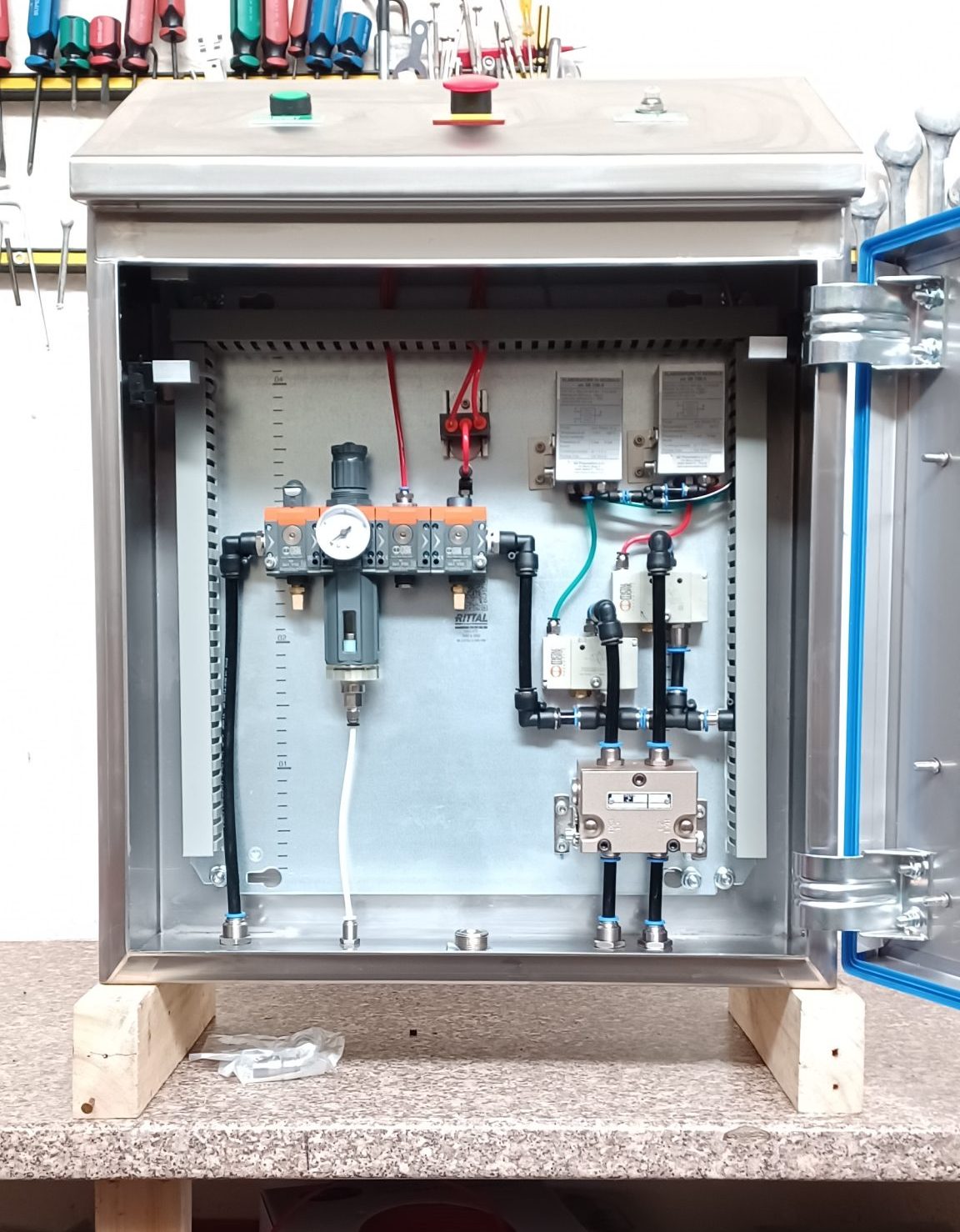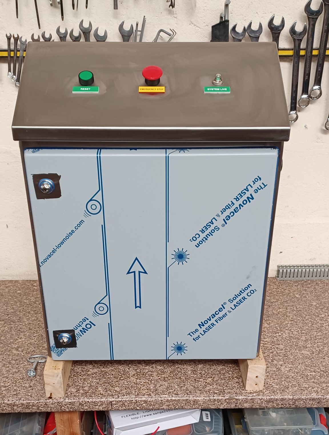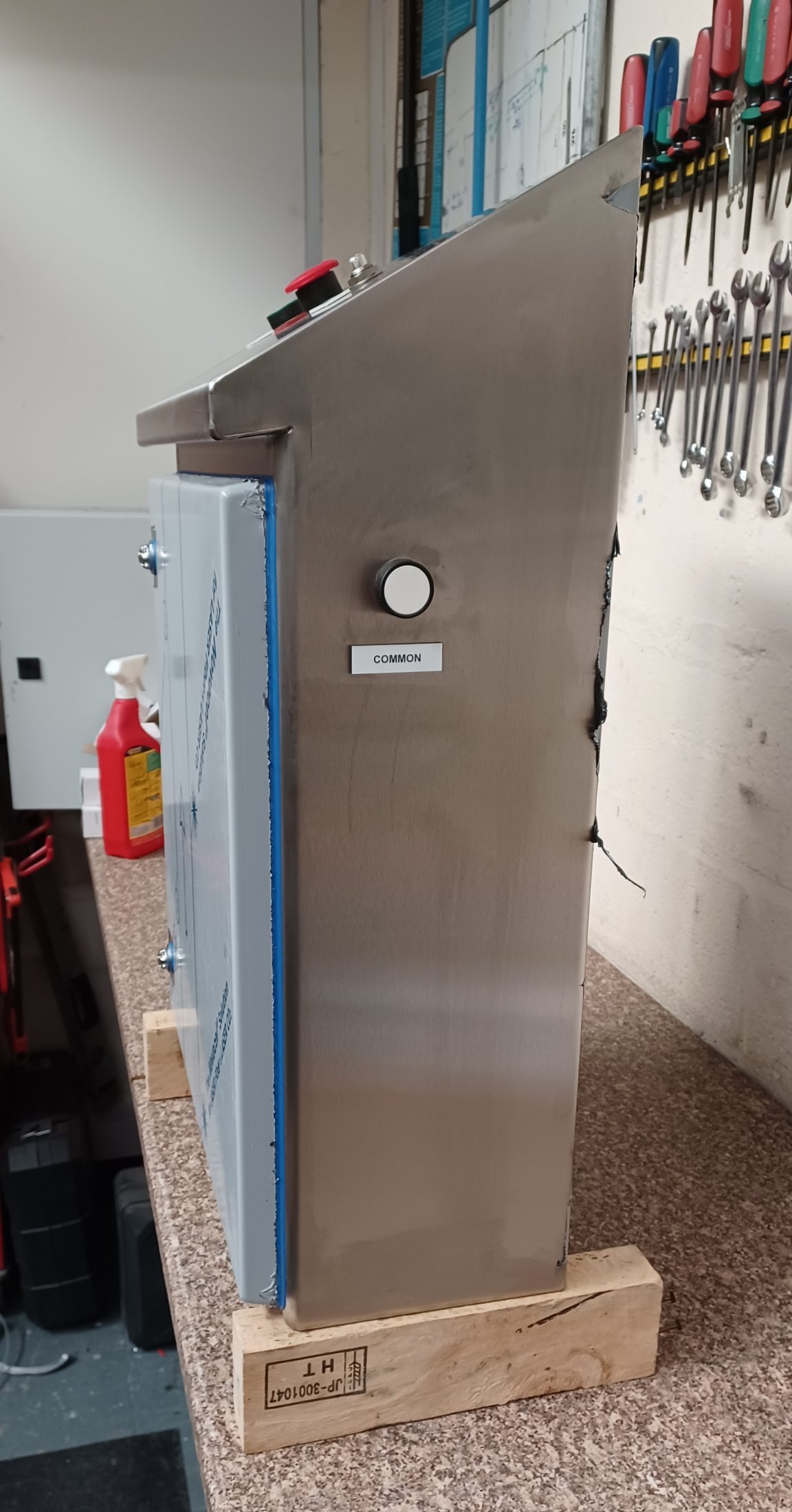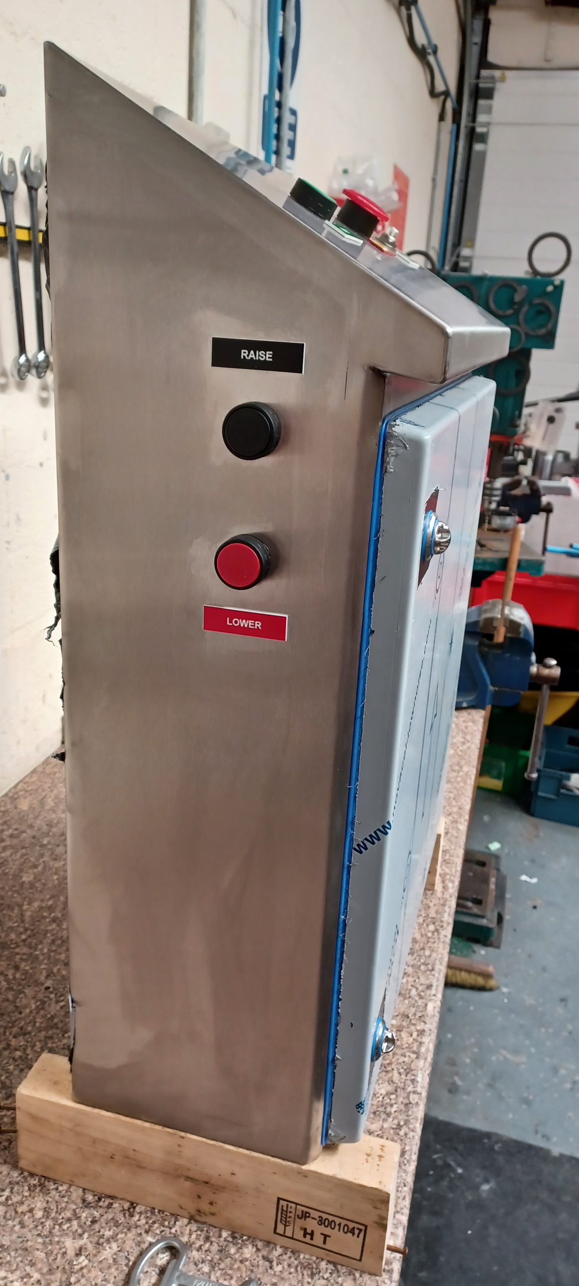 This stainless steel washdown control panel was designed to withstand the elements and reduce rusting. It includes a sloping top & special seals and was used to tilt our customers machine safely.